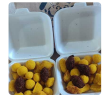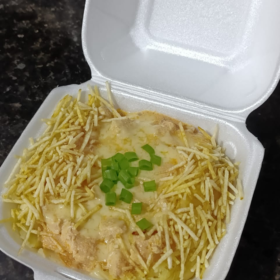 Batata cozida temperada e recheada com strogonoff de frango, acompanha batata palha.
