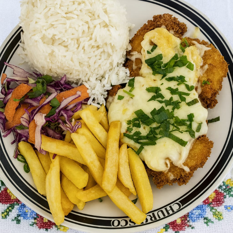 Arroz, Bife Parmegiana Com Molho e Queijo, Batata Frita, Salada