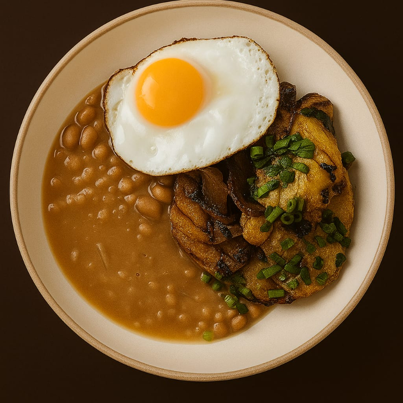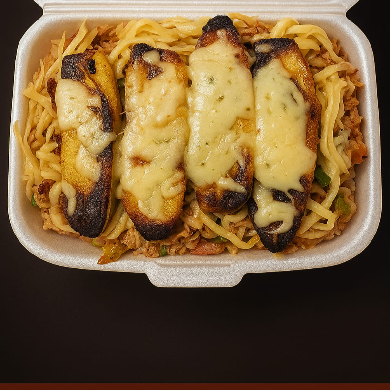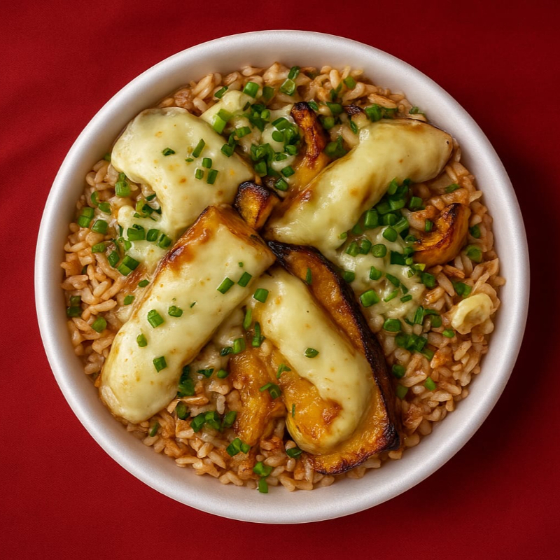 Arroz, Linguiça Calabresa, Bacon, Linguiça de Porco, Pimentão, Cebola, Queijo, Banana Frita