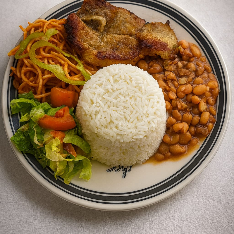 Arroz, Feijão, Macarrão, Bife De Porco Com Cebola, Saladinha