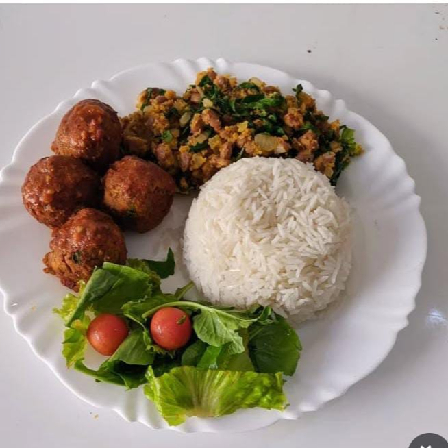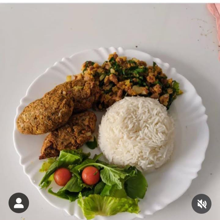 Arroz, Carne De Soja Sabor Bacon, Com Mandioca E Salada