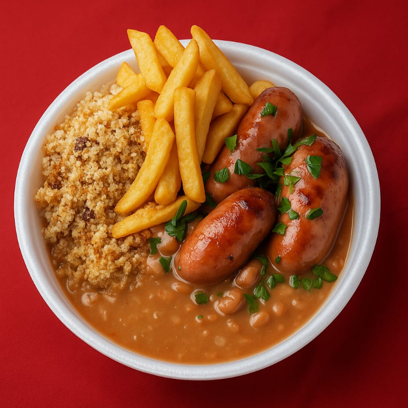 Arroz, Feijão, linguiça Assada, batata Frita, Farofa