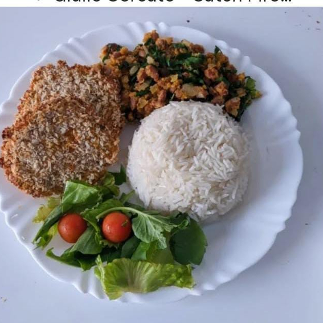 Feijão tropeiro arroz,bife empanado de grão de bico,saladinha
