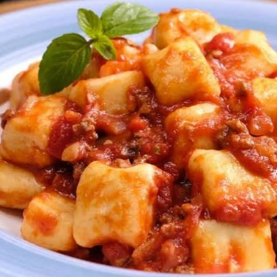 Nhoque, Queijo, Molho Bolonhesa Com Carne Moida, Cheiro verde, Arroz