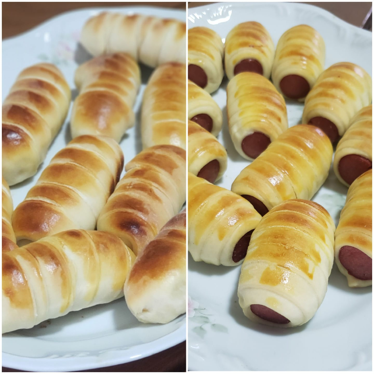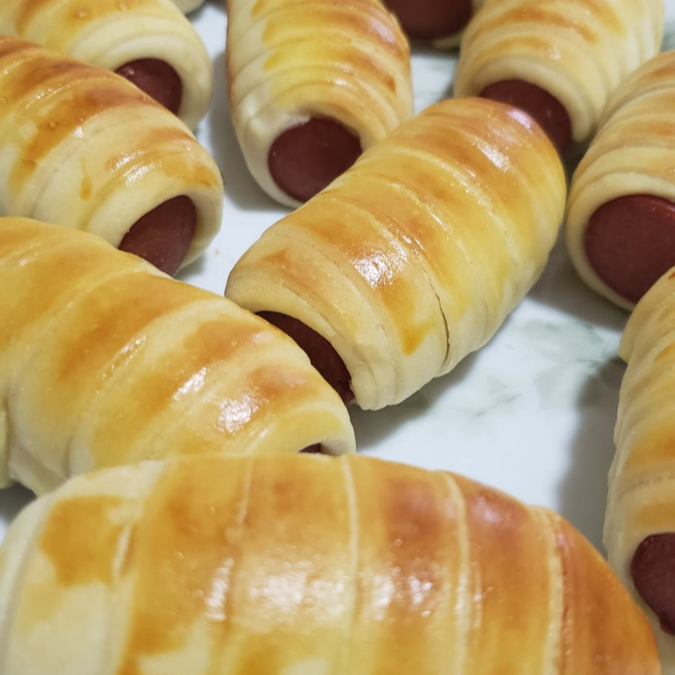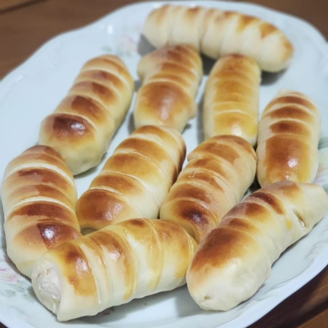 Bandeja com 7 enroladinhos de queijo e 7 de salsicha