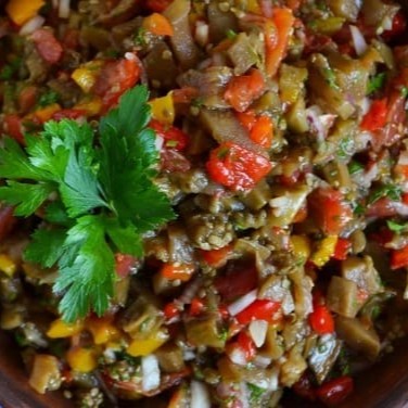 Berinjela, pimentão vermelho, azeitonas fatiadas, uva passas, cebola, vinho tinto e azeite de oliva Libanês