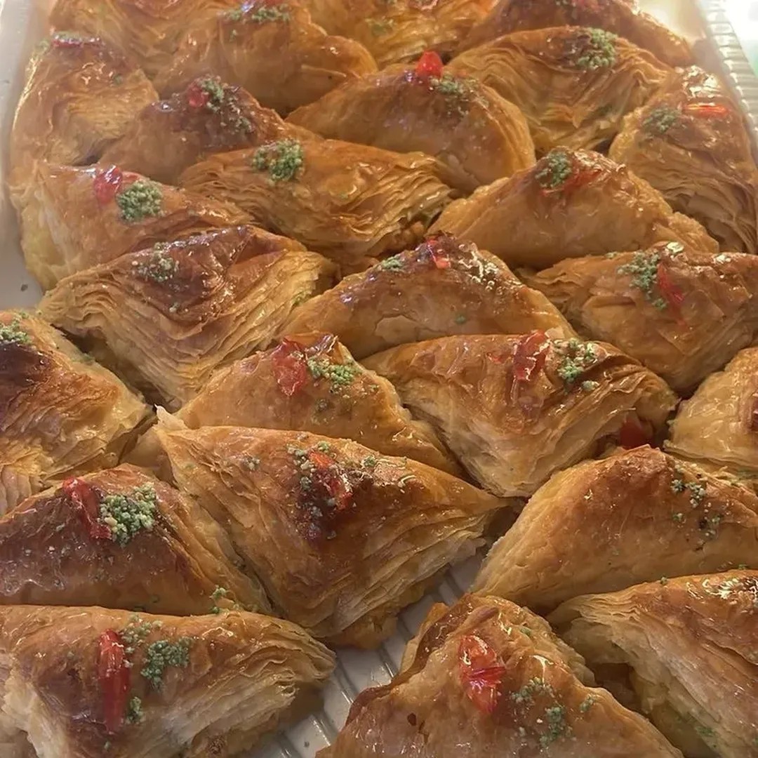 Folhado massa caseira bem fina, recheado com pistache e banhados com calda de agua de rosas