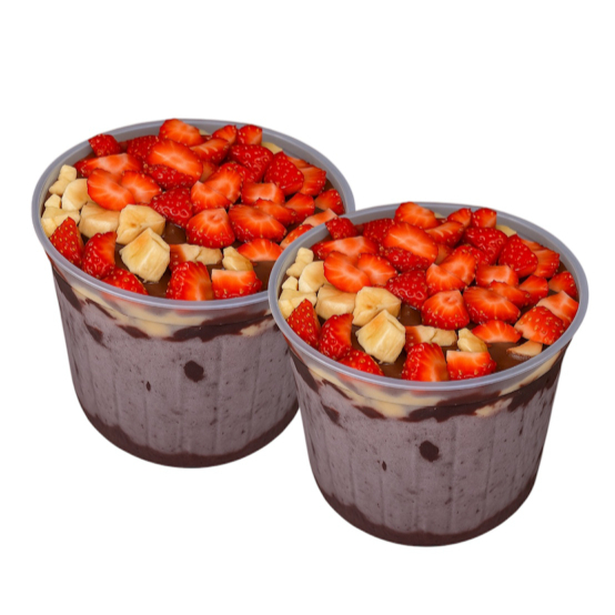São 2 vulcões de açai de 500ml, todos eles com os seguinte complementos: Granola, leite em pó, leite condensado, banana, morango e creme de avelã