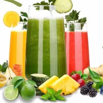 Sucos naturais de laranja, suco detox, suco de morango.