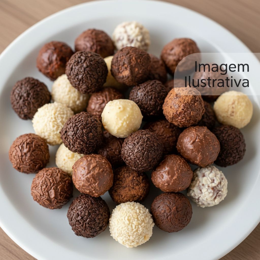 Uma seleção de trufas de diferentes sabores: chocolate ao leite, brigadeiro, maracujá, limão siciliano e beijinho.