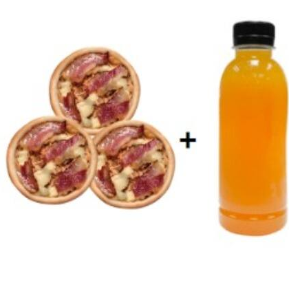 3 ESFIHAS CARNE BACON E QUEIJO + 1 SUCO DE LARENJA 500ml (SÓ O CALDO)