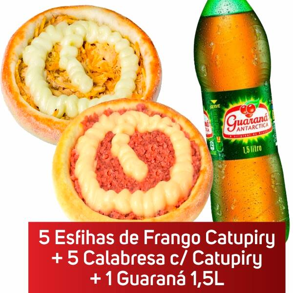 5 Esfihas de Frango com Catupiry +5 Esfihas de Calabresa com Catupiry + 1 Guaraná Antárctica 1,5l (não acrescentamos ou retiramos itens do recheio)