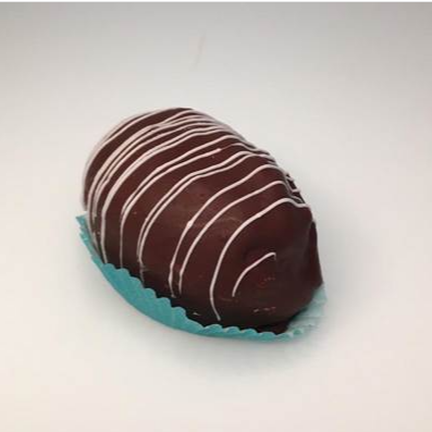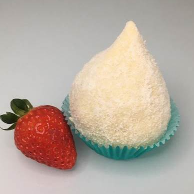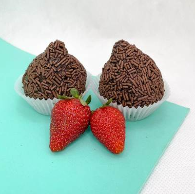 Bombom de morango, coberto com camada de Beijinho (Coco) e mergulhado no chocolate meio amargo.