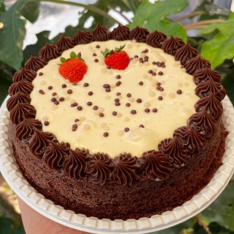 Bolo caseirinho de chocolate com cobertura de Brigadeiro Gourmet.