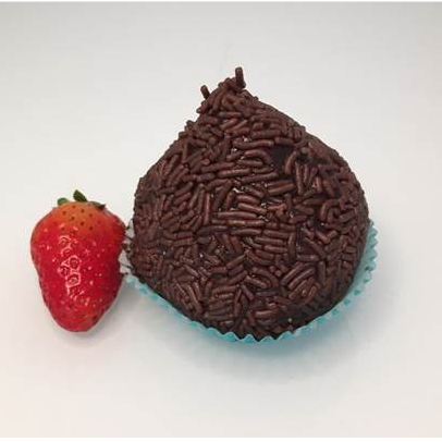 Esse doce tem um morango inteiro e é coberto com brigadeiro gourmet. Valor de 1 unidade.