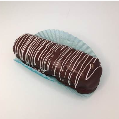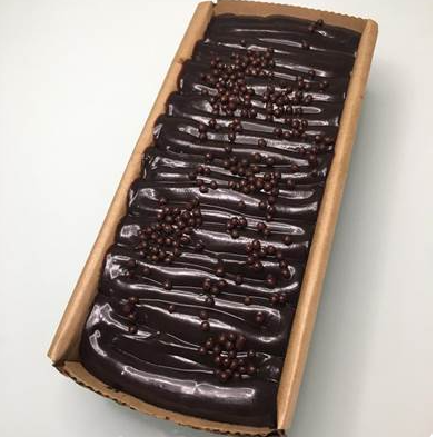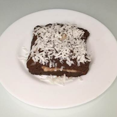 Esse bolo tem massa de chocolate, recheio de coco (o famoso prestigio), é mergulhado na calda de chocolate, leva coco flocado em cima.