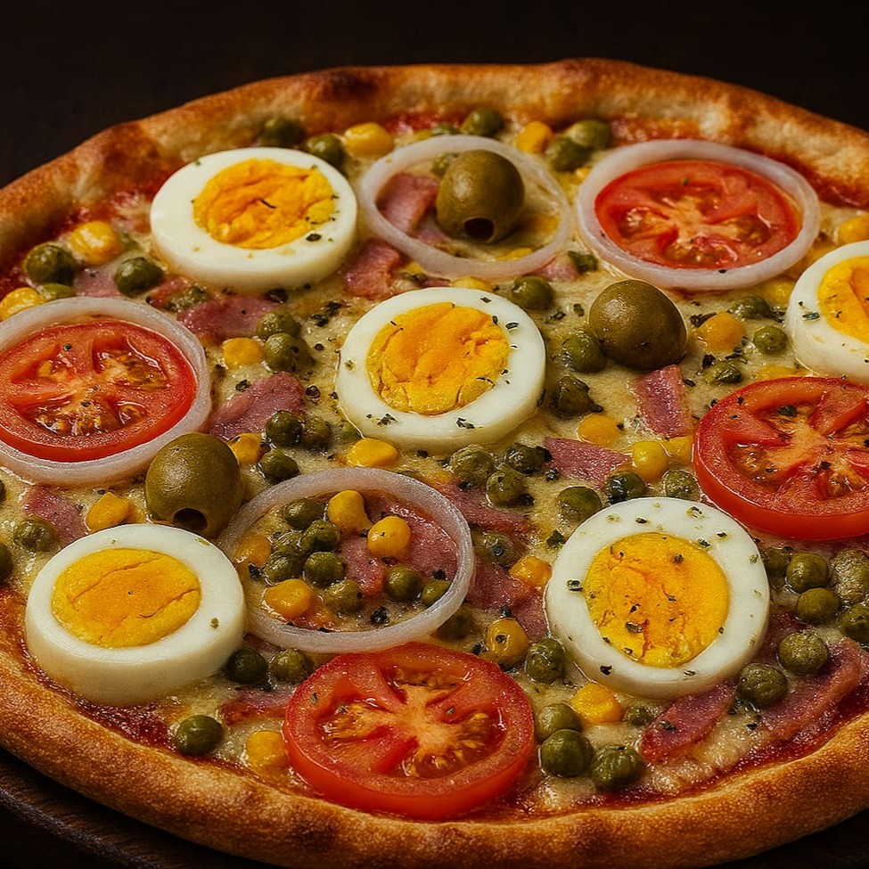 Oferta promocional de pizzas bom e barato Molho de tomate, mussarela, presunto, ervilha, palmito, cebola, ovos, tomate e azeitona.