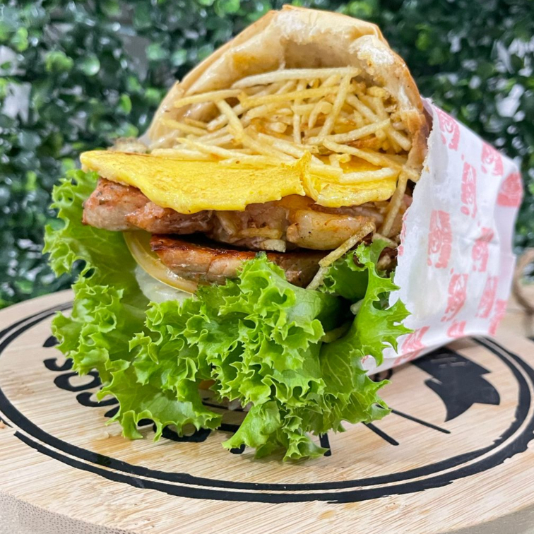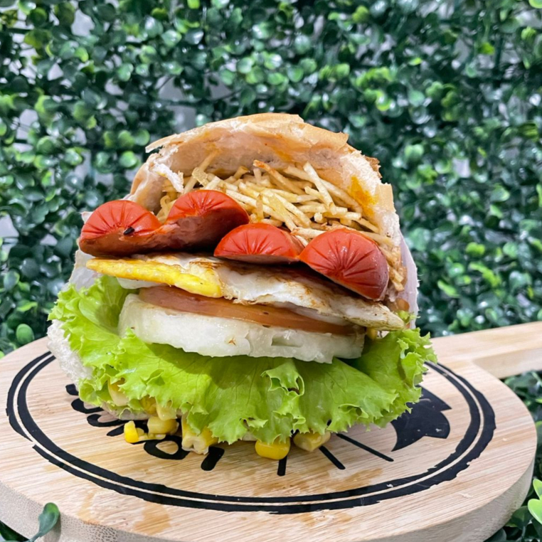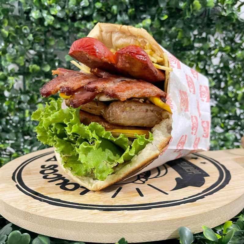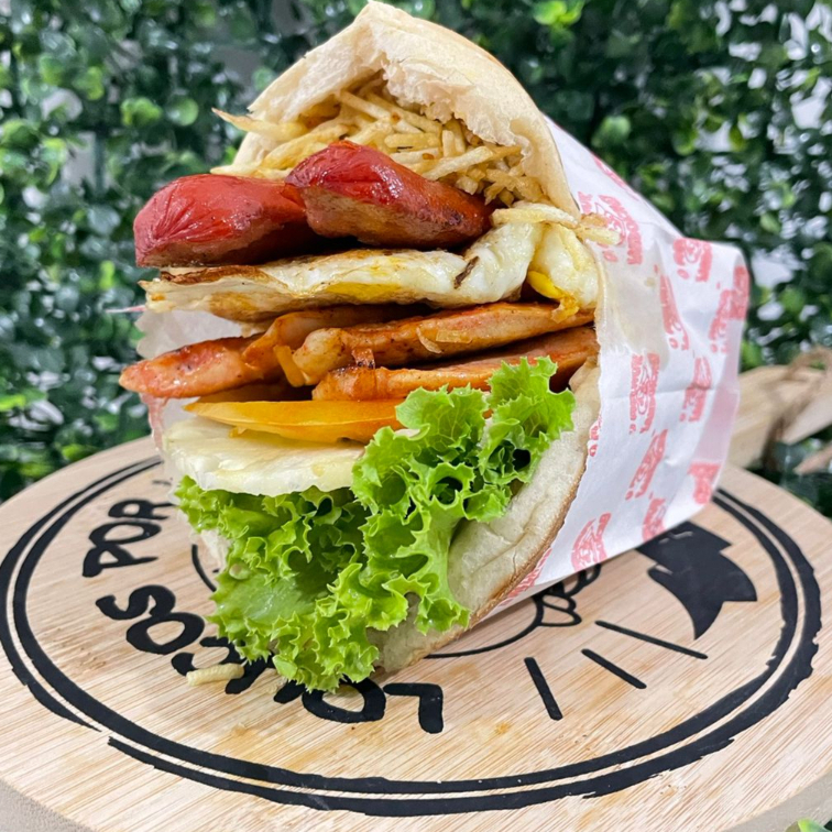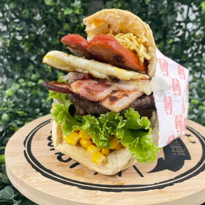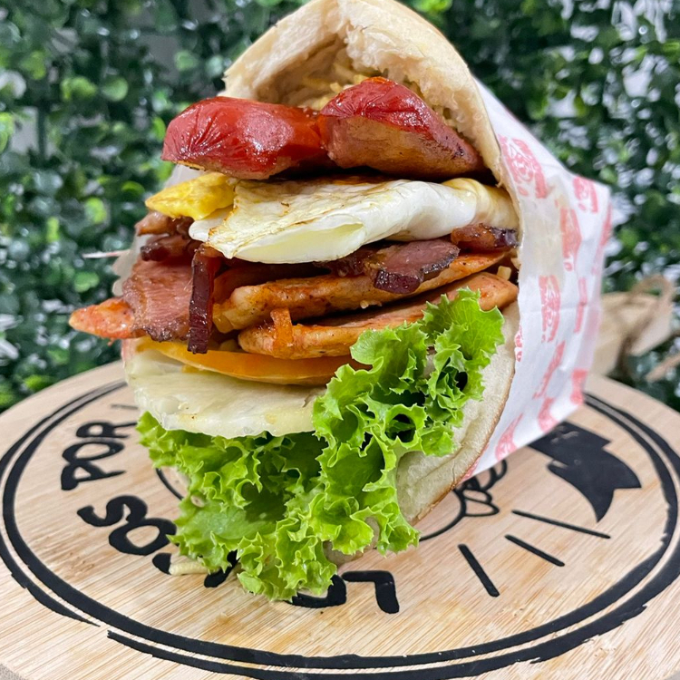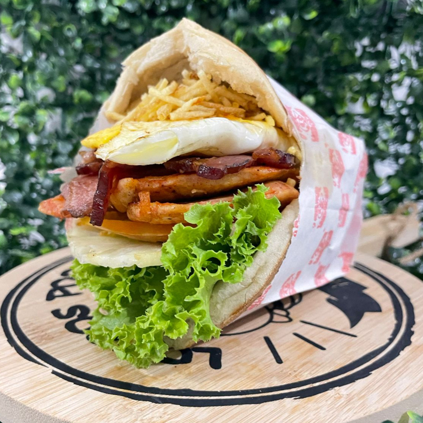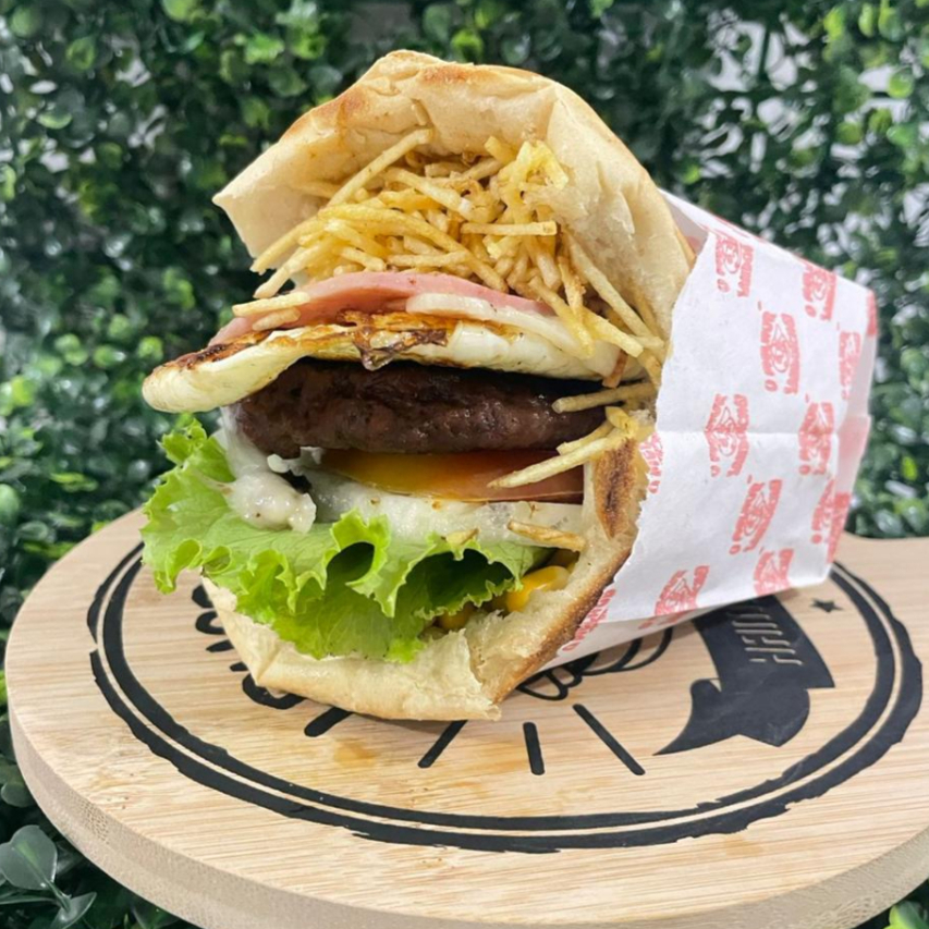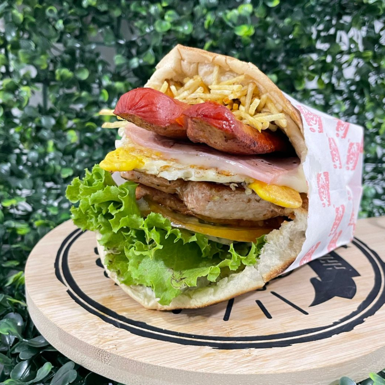 Pão, carne , bacon, ovo, presunto, muçarela,