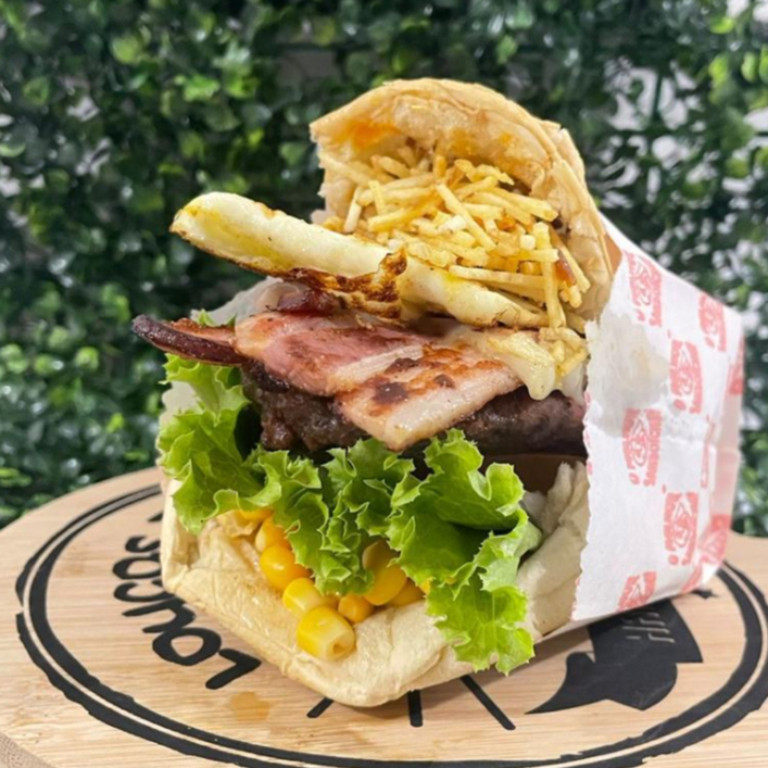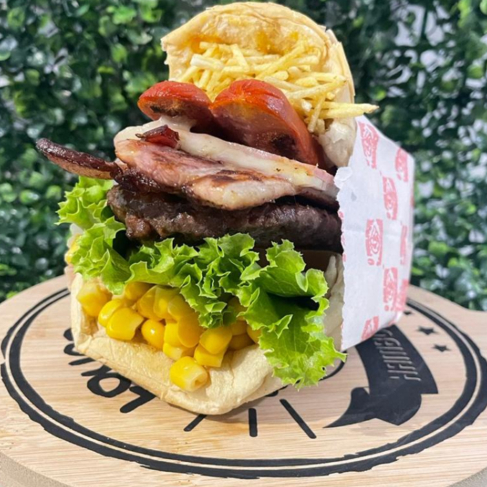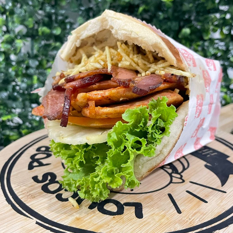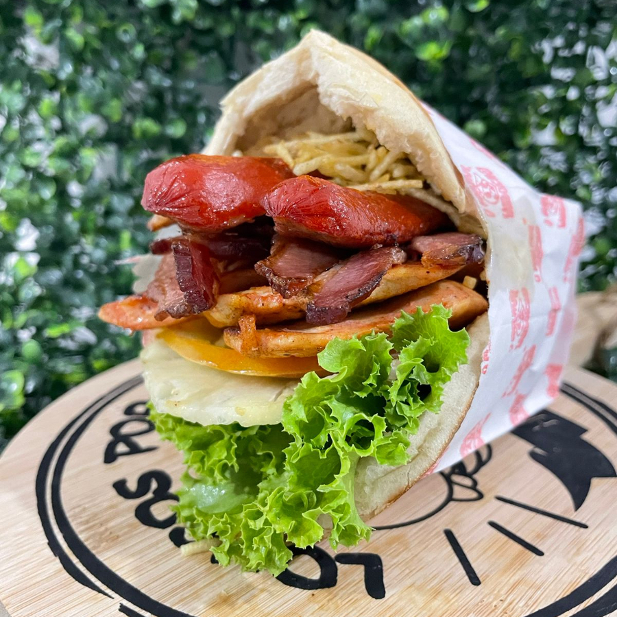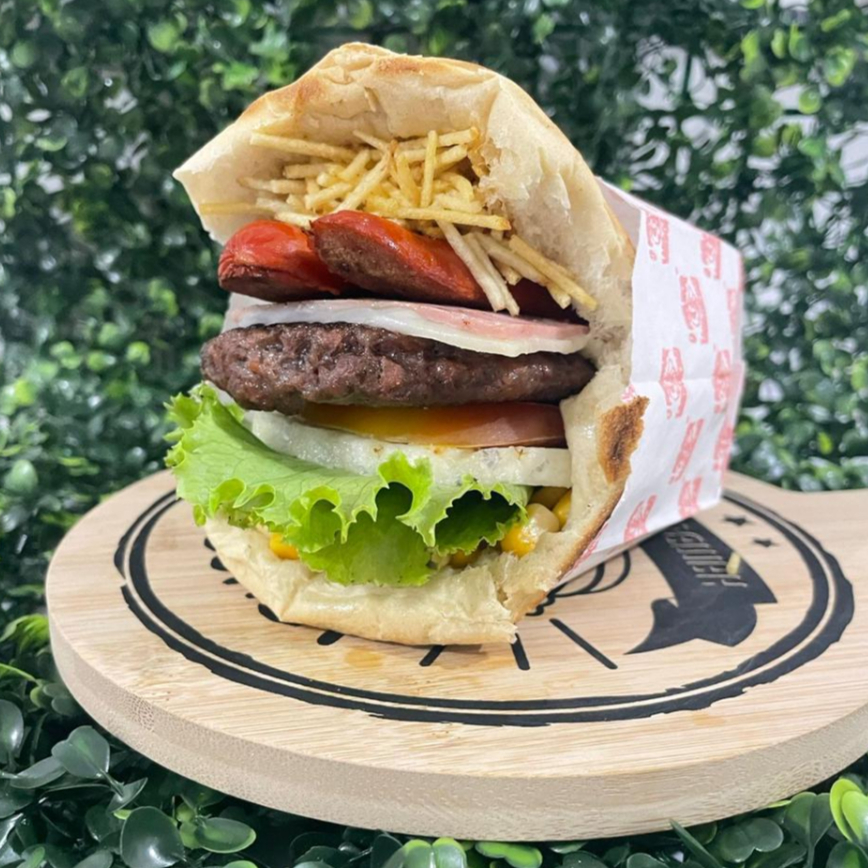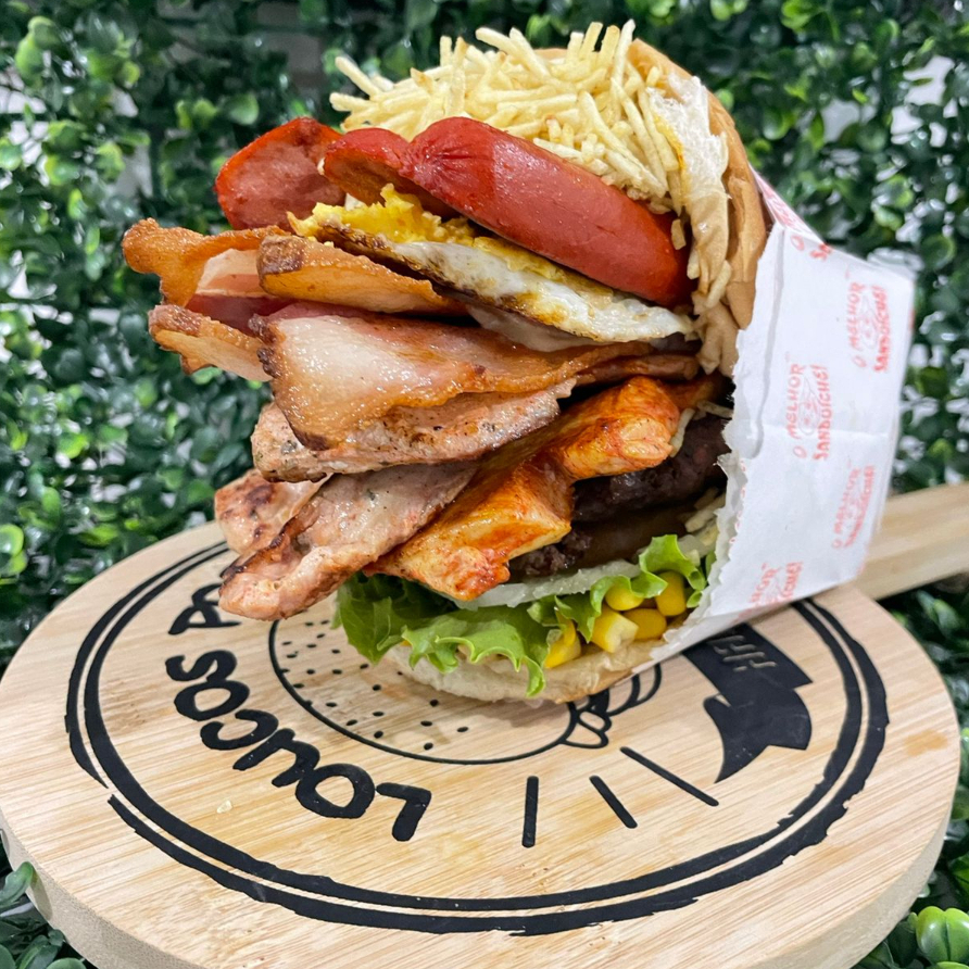 Pão, carne, bacon, ovo, presunto, muçarela, tomate, alface, abacaxi, milho e batata palha