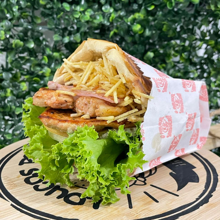 Pão, carne , bacon, presunto, muçarela,