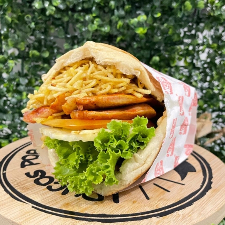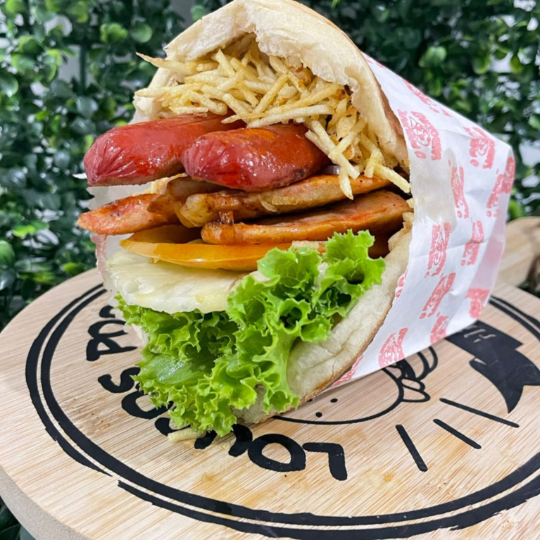 Pão, carne, salsicha, presunto, mucarela,