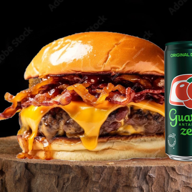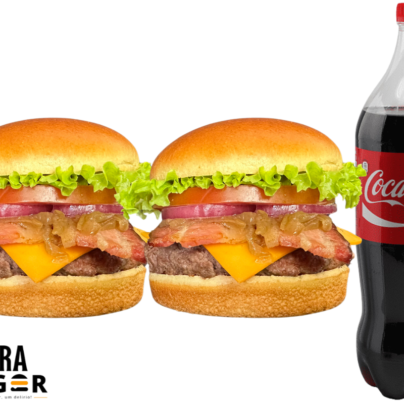 Hambúrguer de 100g no pão brioche com bacon, cheddar, cebola roxa, alface, tomate e maionese exclusiva. Acompanha Coca-Cola 1l ou Guaraná 1l. Irresistível!