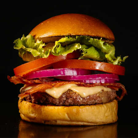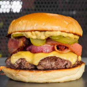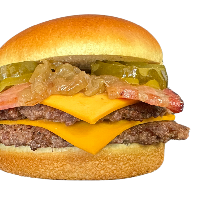 Hambúrguer de 100g no pão brioche, com bacon, cheddar, alface, tomate, cebola roxa e escolha de maionese verde ou defumada. Sabor em dobro!