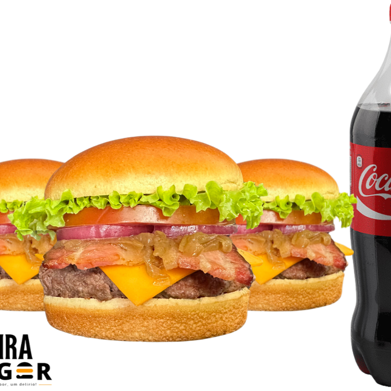 Três hambúrgueres de 100g no pão brioche, com cheddar, bacon, cebola caramelizada, picles e maionese da casa. Acompanha batatas fritas ou anéis de cebola e um Refri lata 350ml. Uma experiência gastronômica definitiva!