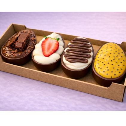 São quatro mini ovos de 50g com os sabores de chocolate com brownie,ninho com morango, ninho com Nutella e maracujá