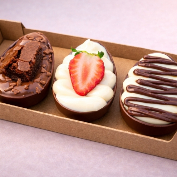 São três Mini Ovos de 50 gramas cada um,nos sabores de Ninho com Morango, Ninho com Nutella e Chocolate com Brownie