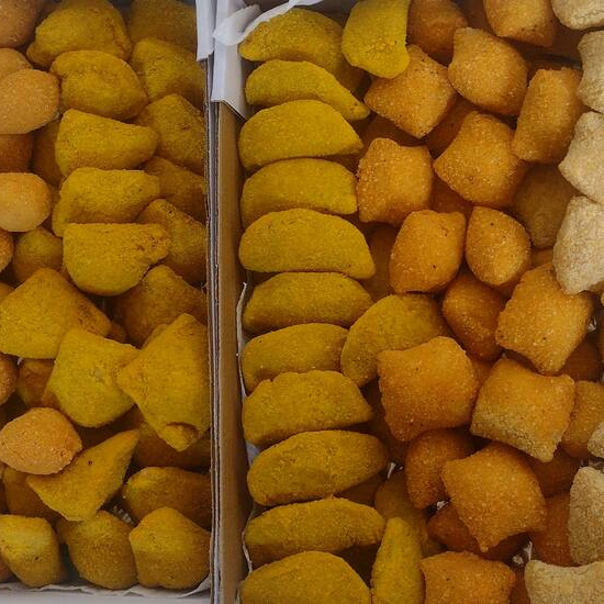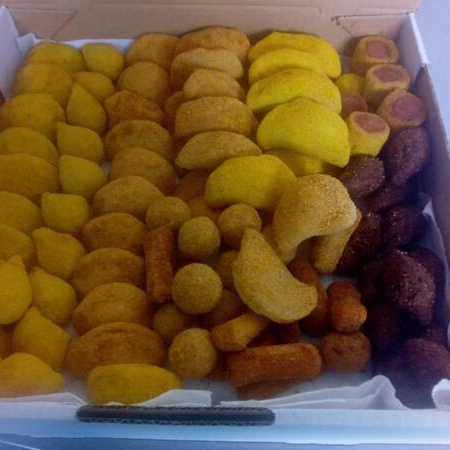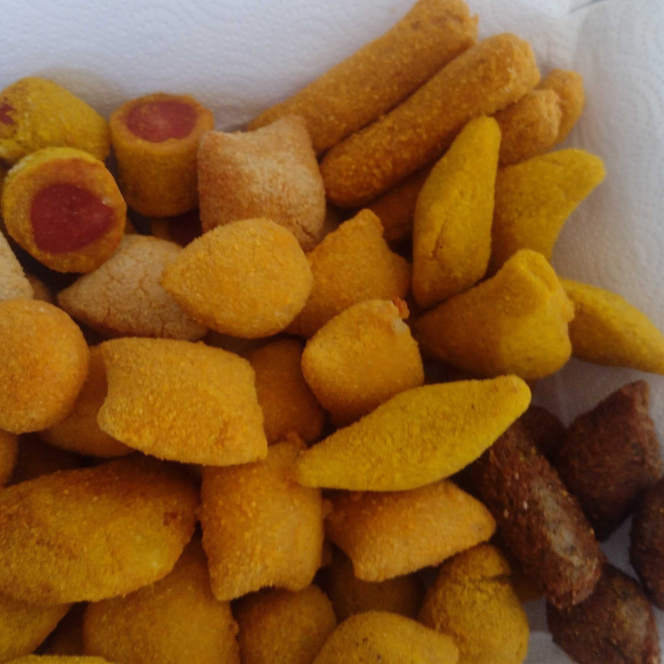 Coxinha de frango Coxinha de provolone Risole de Milho Risole de queijo Pastelaõzinho de carne Pastelaõzinho de queijo c presunto Kibe Enroladinho de salsicha
