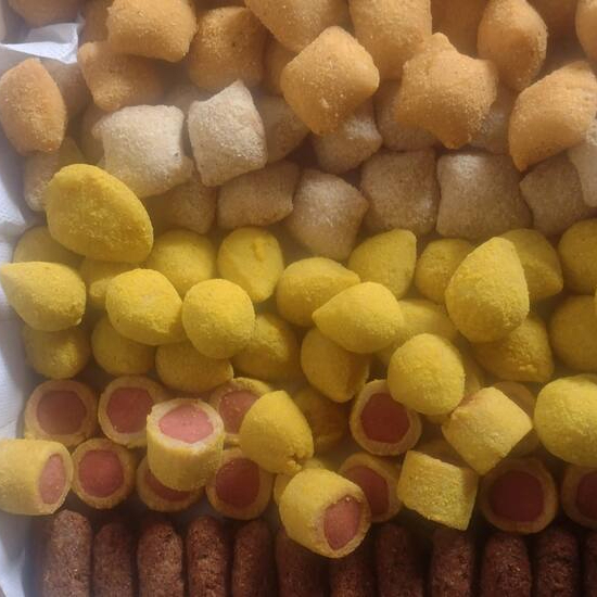 Salgados Variados Coxinha de frango /Coxinha de provolone/ Risole de Milho/ Risole de queijo/ Pastelaõzinho de carne /Pastelaõzinho de queijo c presunto /Kibe/ Enroladinho de salsicha