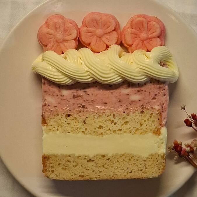 Pão de ló branco fofinho e molhadinho, recheado com creme de leite Ninho e mousse de morango com geleia de morango artesanal, decorado com cobertura de Ninho e morangos frescos. Todos os bolos são decorados com docinhos variados, conforme a produção do Dia.