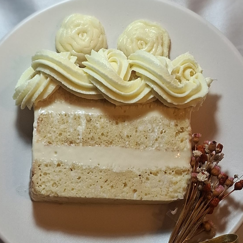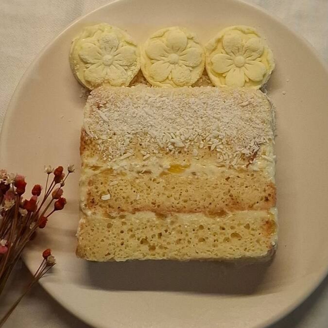 Pão de ló branco, fofinho e molhadinho, recheado com creme de coco e geleia abacaxi artesanal, decorado com cobertura de coco. Todos os bolos são decorados com docinhos variados, conforme a produção do Dia.