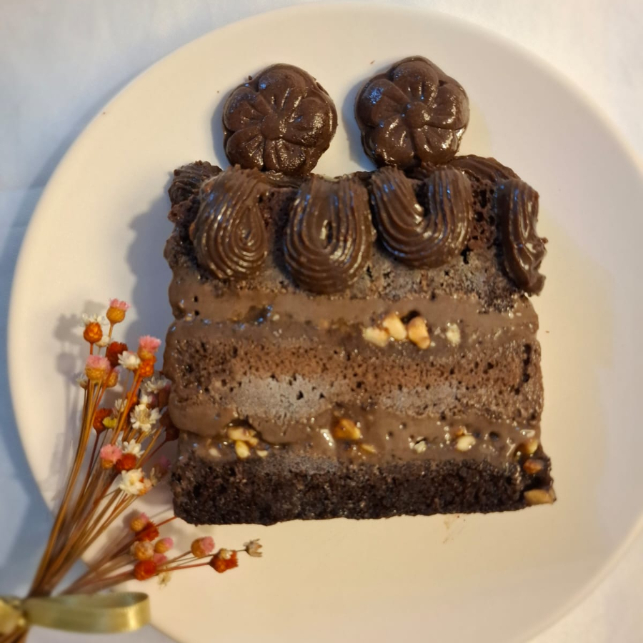 Pão de ló de chocolate, fofinho e molhadinho, recheado com creme de brigadeiro de chocolate meio amargo e decorado com cobertura ganache de chocolate. Todos os bolos são decorados com docinhos variados, conforme a produção do Dia.