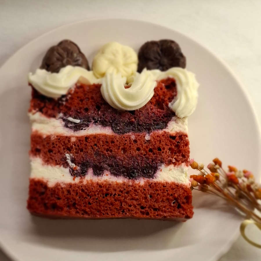 Uma massa vermelha fofinha e molhadinha, recheada com creme suave de chocolate branco com cream cheese e frutas vermelhas, decorado com cobertura cremosa. Todos os bolos levam cobertura cremosa e decoração com docinhos variados, conforme a produção do Dia.