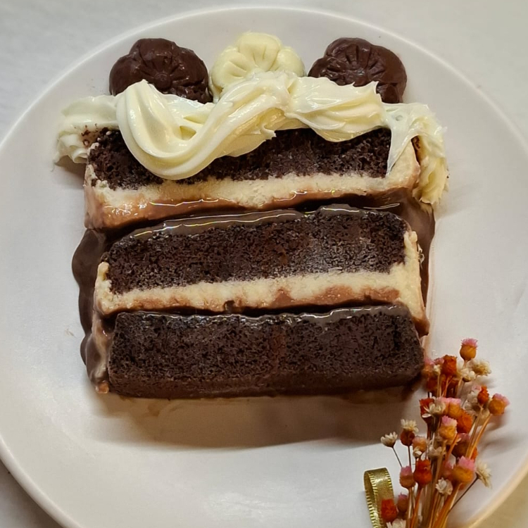 Um pão de ló de chocolate fofinho e molhadinho, recheado com creme de coco e brigadeiro de chocolate meio amargo, decorado com cobertura de chocolate. Todos os bolos são decorados com docinhos variados, conforme a produção do Dia.