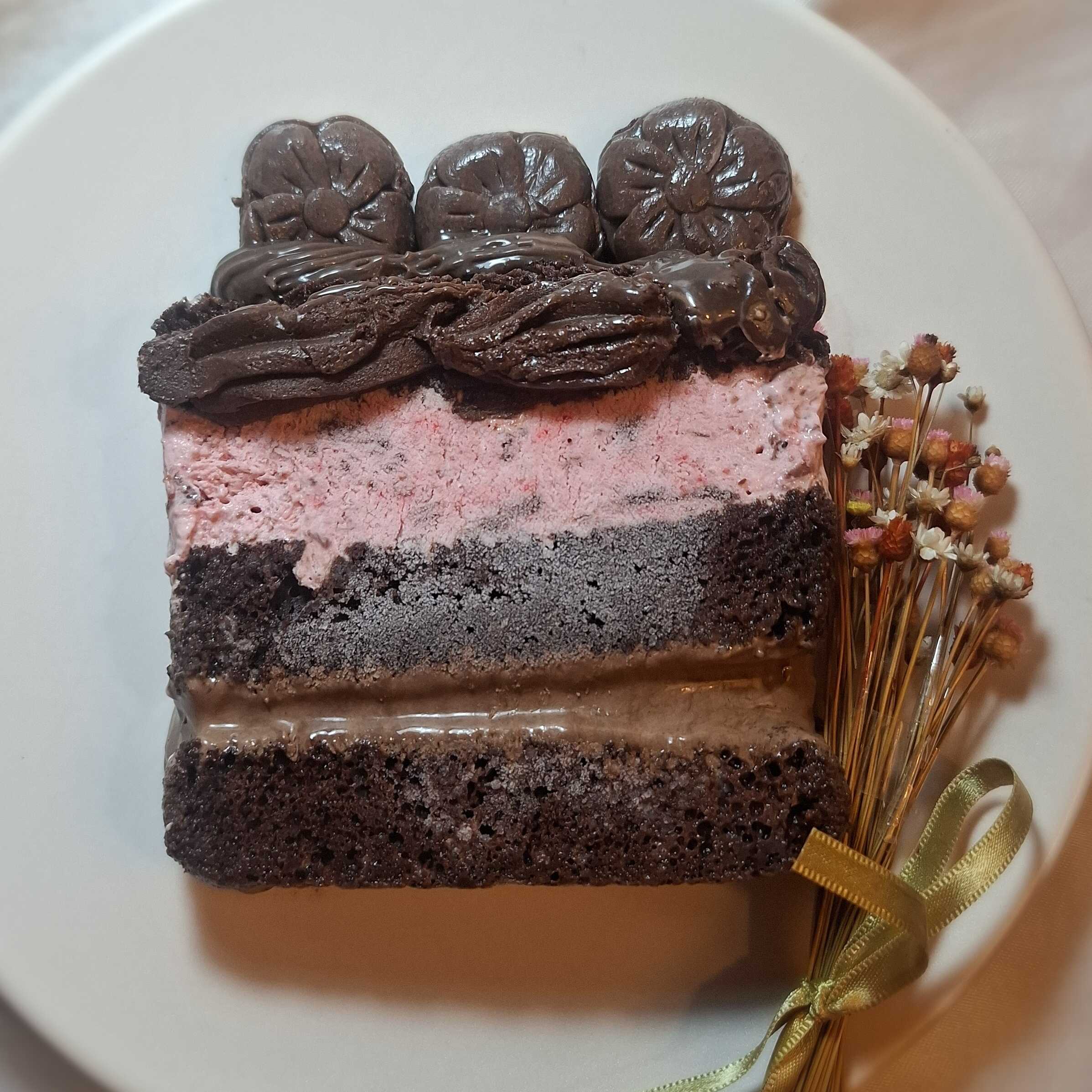 Pão de ló de chocolate fofinho e molhadinho, recheado com mousse de morango (Nesquik e geleia artesanal) e brigadeiro de chocolate ao leite, decorado com cobertura de chocolate e morangos frescos. Todos os bolos são decorados com docinhos variados, conforme a produção do Dia.