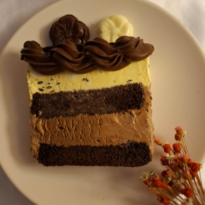 Um pão de ló de chocolate fofinho e molhadinho, recheado com creme de chocolate meio amargo e um delicioso mousse de maracujá, decorado com cobertura de chocolate. Todos os bolos são decorados com docinhos variados, conforme a produção do Dia.