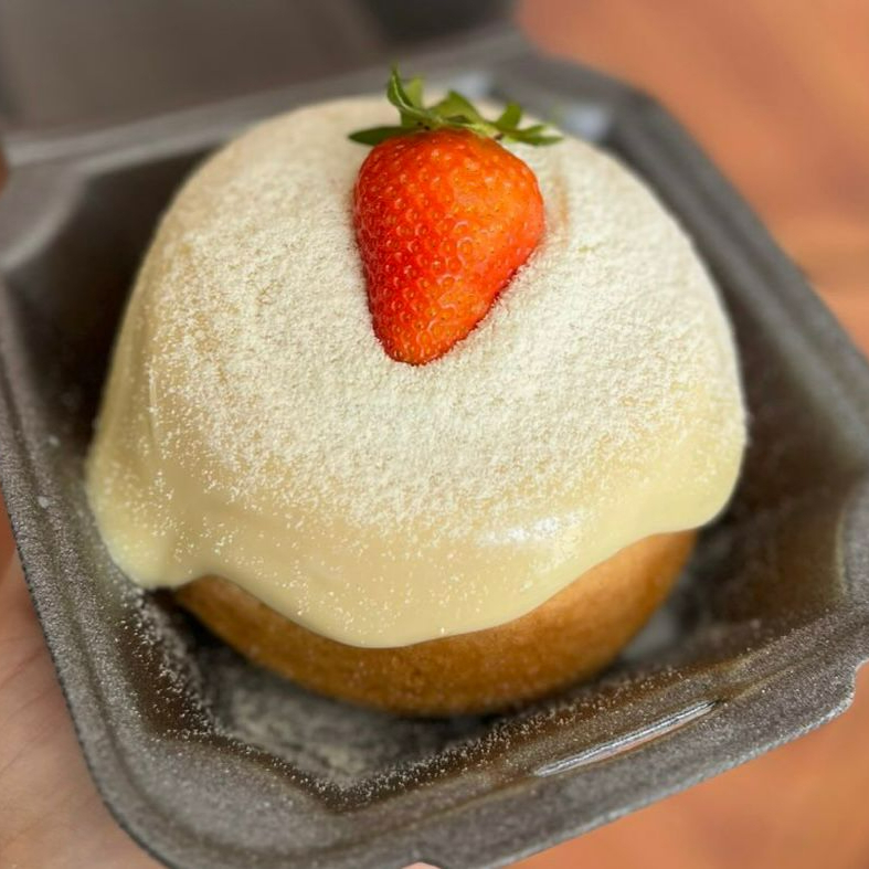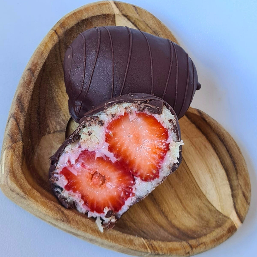 2 DeliciosoS bombons , recheados com brigadeiro de coco e morango fresco .