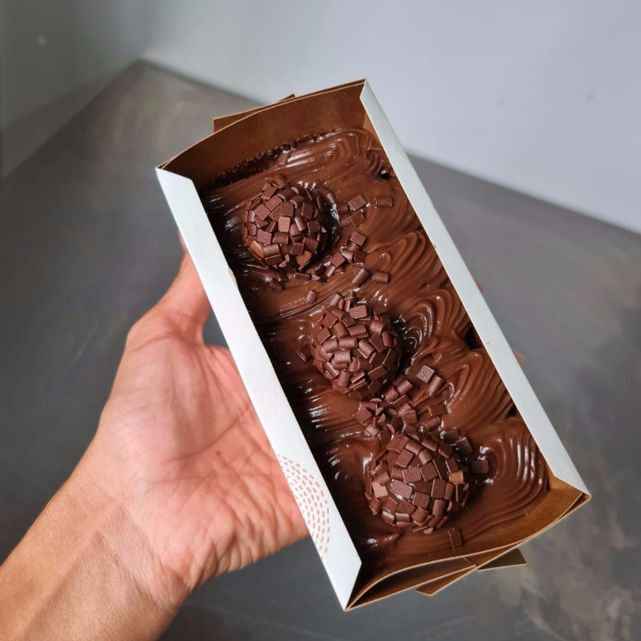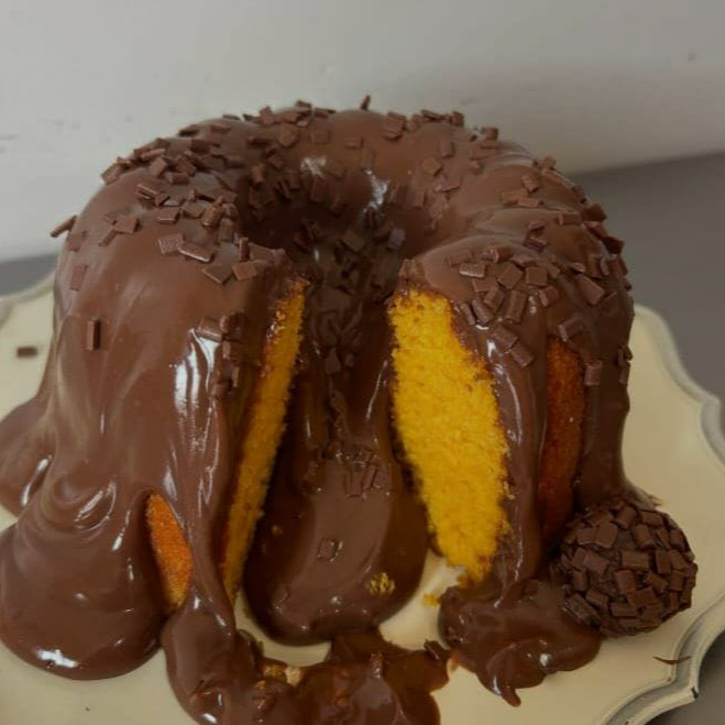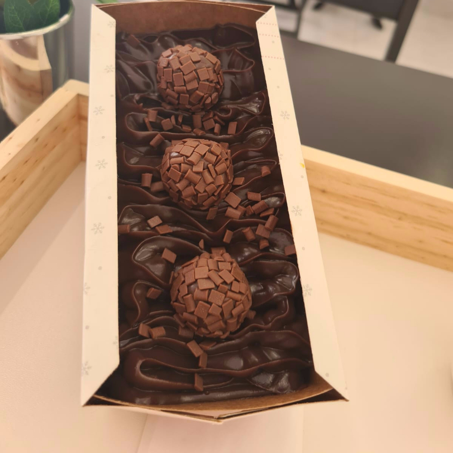 Delicioso bolo caseiro de chocolate , com cobertura de chocolate , mais 3 unidadese de brigadeiro no granulé .