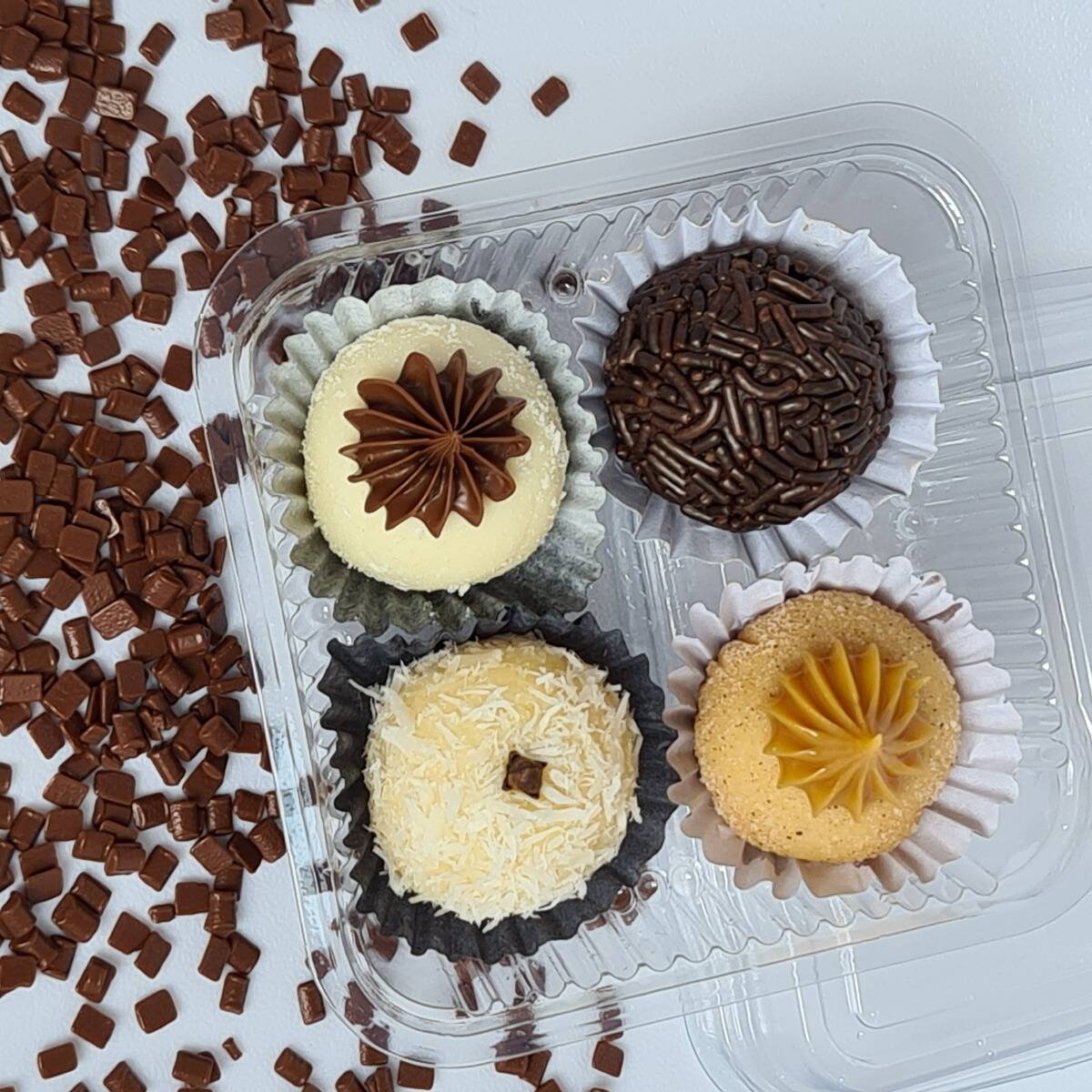 Caixinha contendo 4 deliciosos doces gourmet , sabores variados ( ninho, brigadeiro, coco queimado , ninho e nutella, M e M , casadinho , Ninho , Brigadeiro , Olho de sogra.