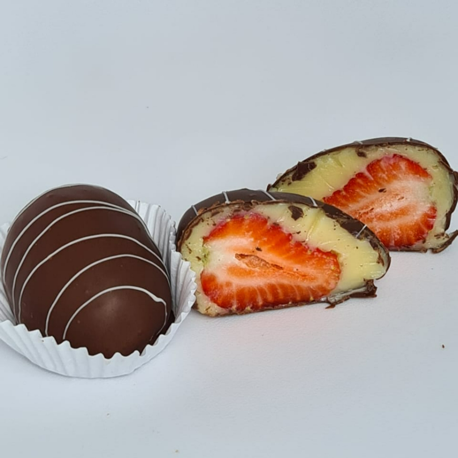 2 Deliciosos bombons de morango , recheados com brigadeiro branco tradicional e morango fresco .