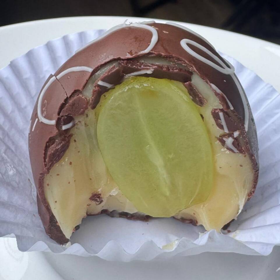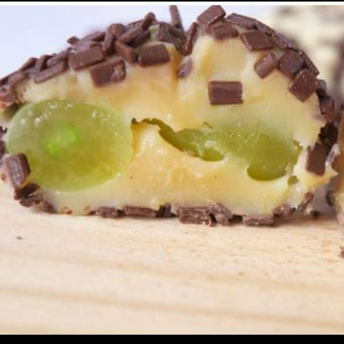Delicioso brigadeirão , recheado de uvas verdes e finalizado no granulé .
