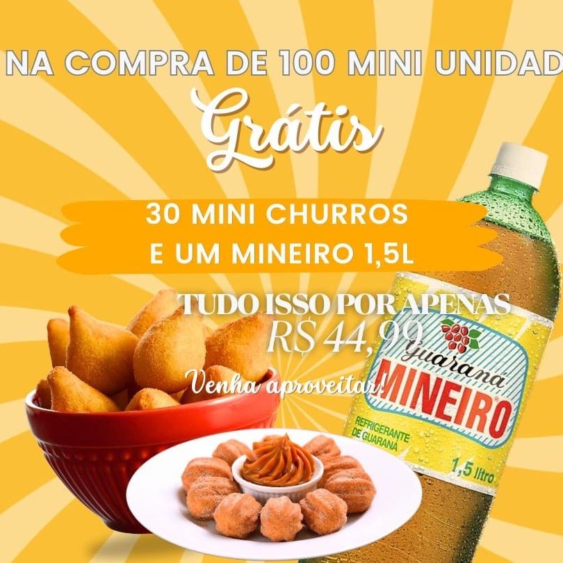 Este Combo Promocional te leva à uma experiência gastronômica inigualável! Com a compra de 100 unidades de mini salgados, você recebe gratuitamente uma refrescante garrafa de 1,5 Litros do autêntico Refrigerante Guaraná Mineiro. Para adocicar ainda mais seu paladar, incluímos nessa oferta uma deliciosa sobremesa composta por 30 Mini Churros. Não perca essa oportunidade única de deleitar-se com esses prazeres culinários em uma única oferta!