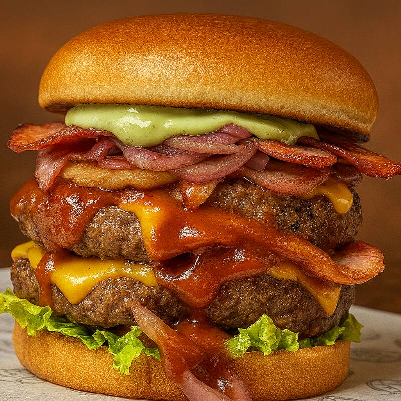 Pão brioche selado, molho especial Dom, dois hambúrgueres bovinos suculentos de 200g cada, duplo queijo cheddar derretido, bacon em dobro, molho barbecue, cebola roxa, alface e tomates frescos.