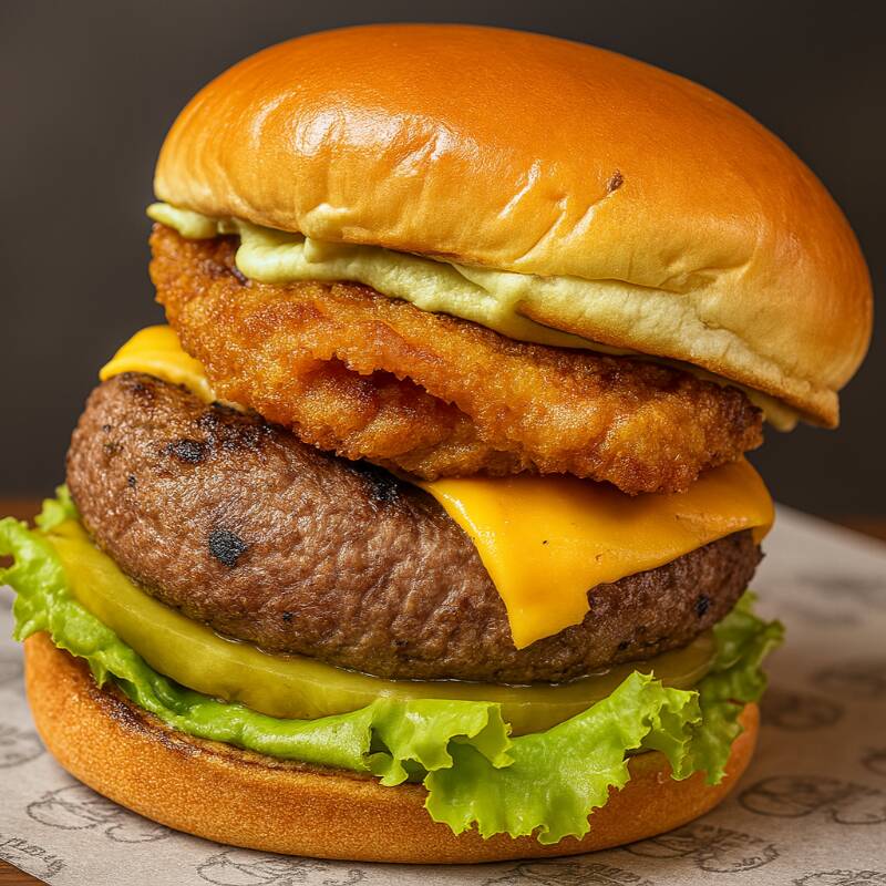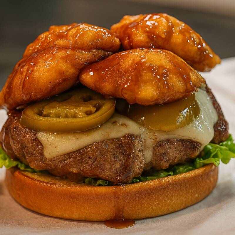 Pão brioche selado, maionese de bacon caseira, hambúrguer bovino suculento de 200g, queijo Monterey Jack maçaricado, picles de jalapeño, alface e tomate fresco, sticks crocantes de queijo gouda e mel. Uma combinação doce, picante e irresistível!