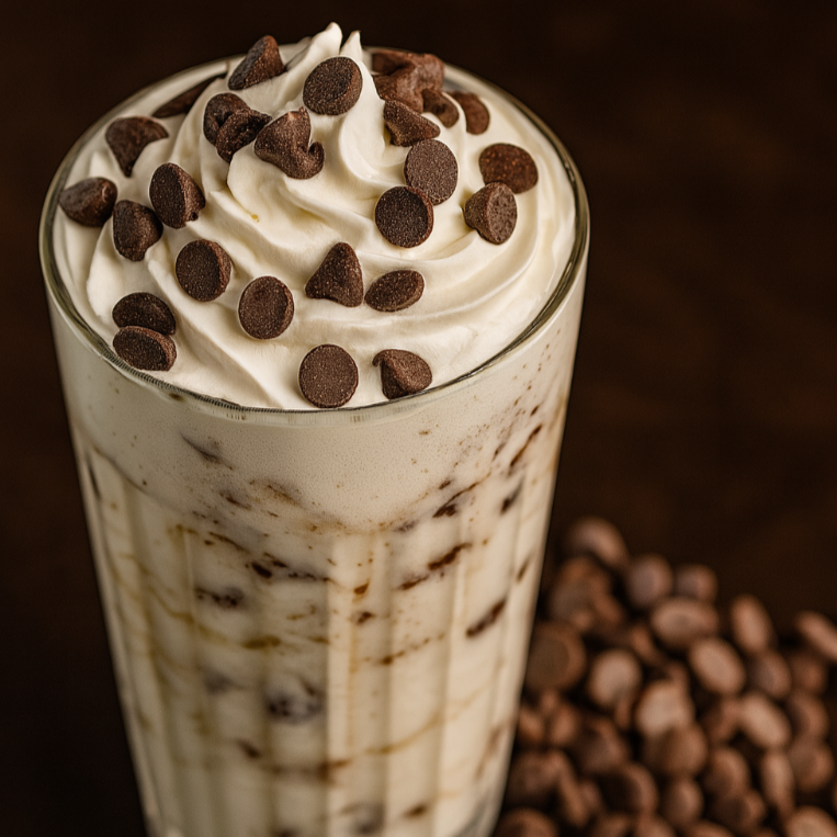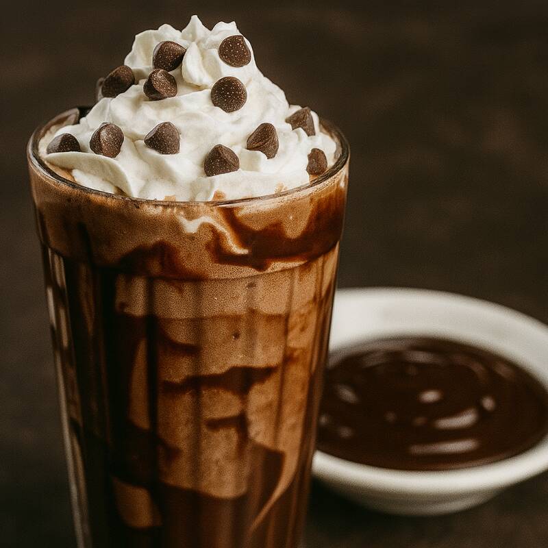 Milkshake de creme de chocolate belga com sorvete trufado, chantilly leve e gotas de chocolate crocantes para finalizar.