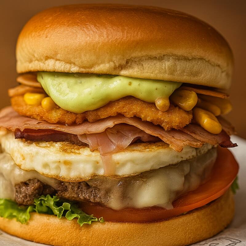 Pão brioche selado, molho especial Dom, hambúrguer bovino suculento de 200g, queijo muçarela maçaricado, ovo frito, bacon crocante, presunto, abacaxi chapeado e dourado, cebola roxa, milho verde refogado na manteiga, alface e tomates frescos.