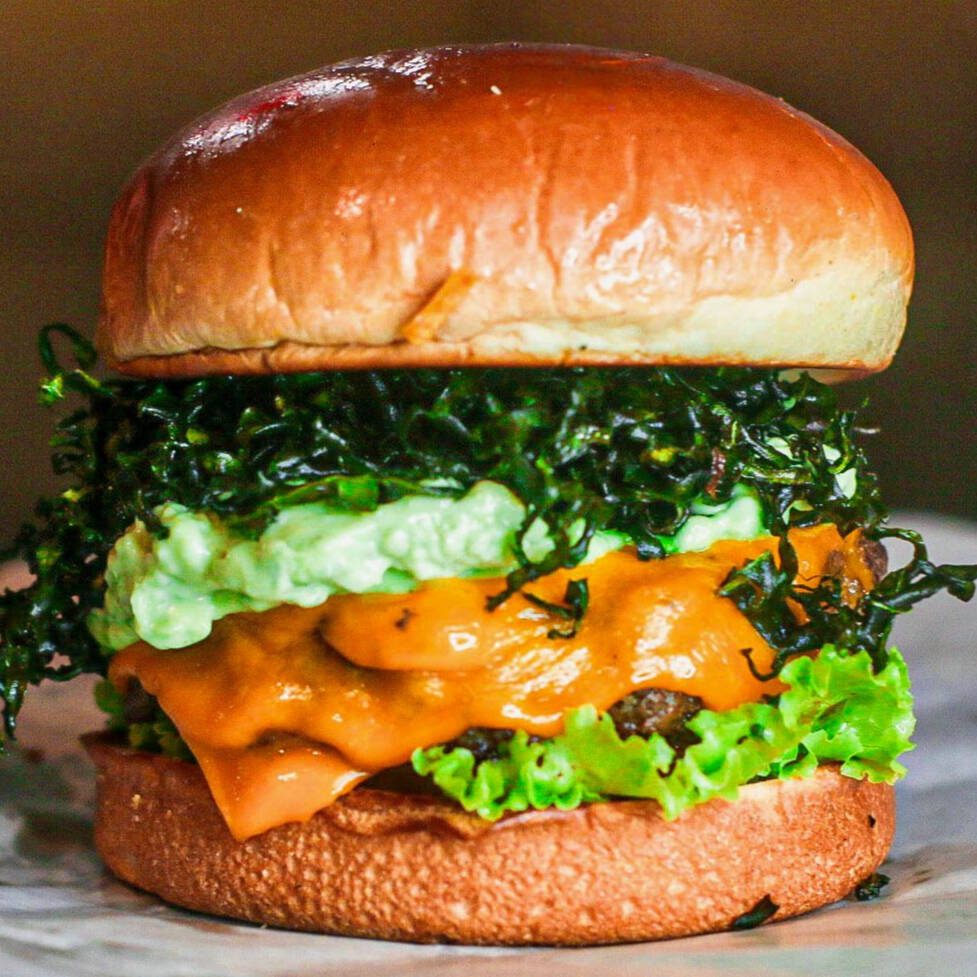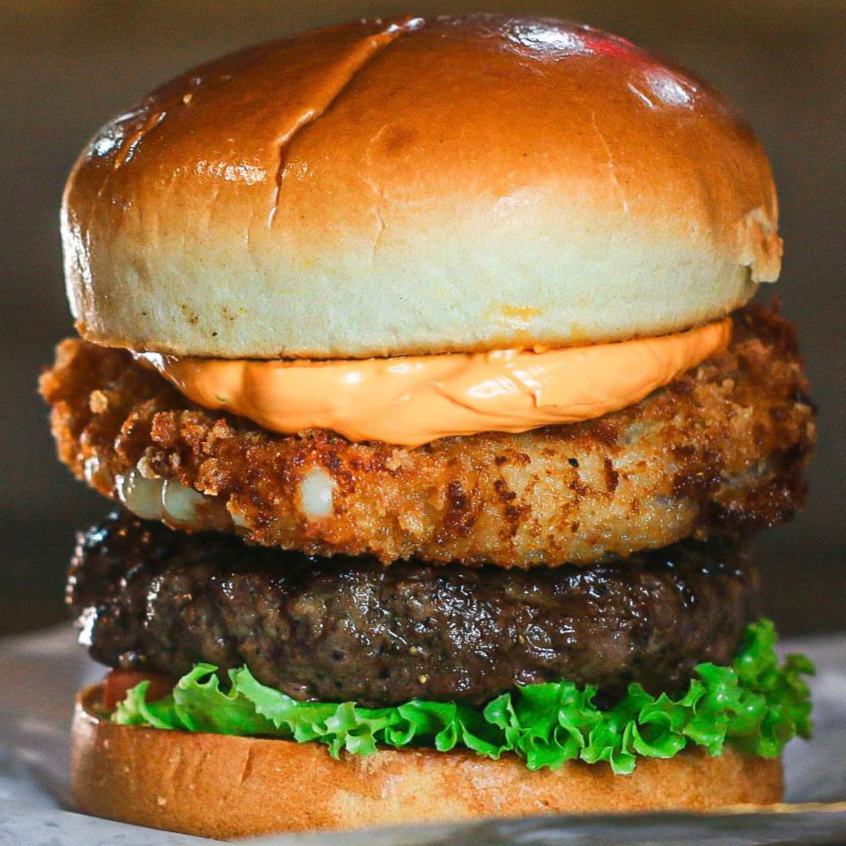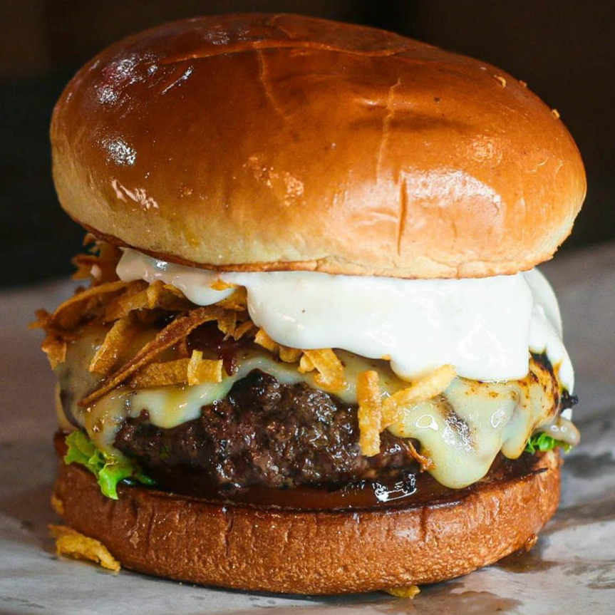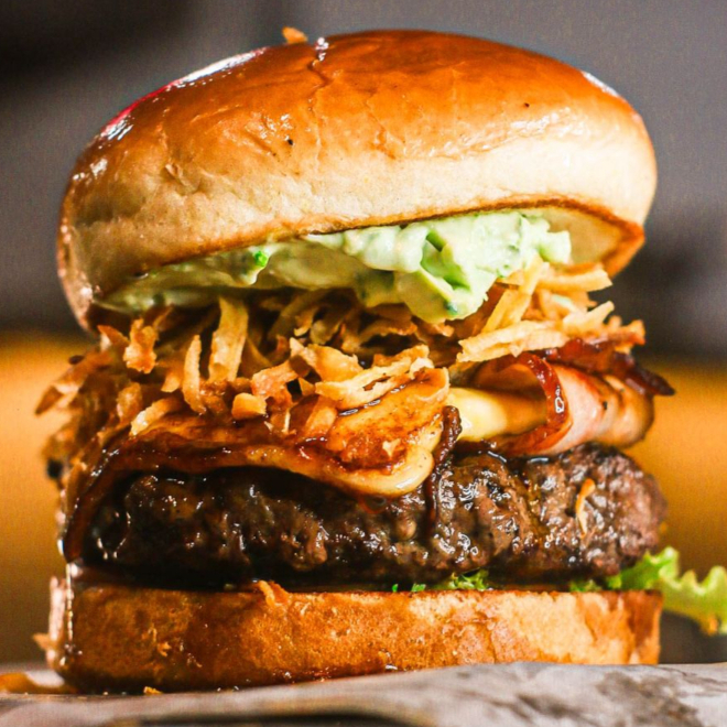 Pão brioche selado, sour cream cremoso, hambúrguer bovino suculento de 200g, queijo Monterey Jack maçaricado, crispy de mandioca, bacon crocante, alface e tomates frescos.